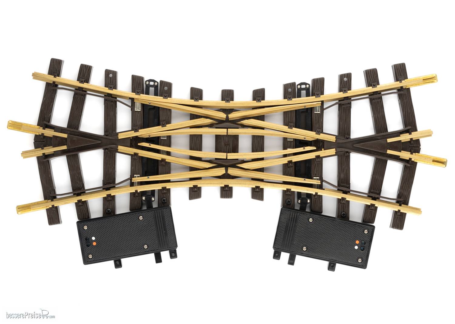 Die LGB 1226 ist eine elektrische Doppelkreuzungsweiche für die Spur G, die das gleichzeitige Kreuzen und Abbiegen auf engem Raum ermöglicht. Mit einer Länge von 375 mm und einem Winkel von 22,5 Grad ist sie wetterfest und robust gefertigt, ideal für den Außeneinsatz in anspruchsvollen Gartenbahnanlagen.