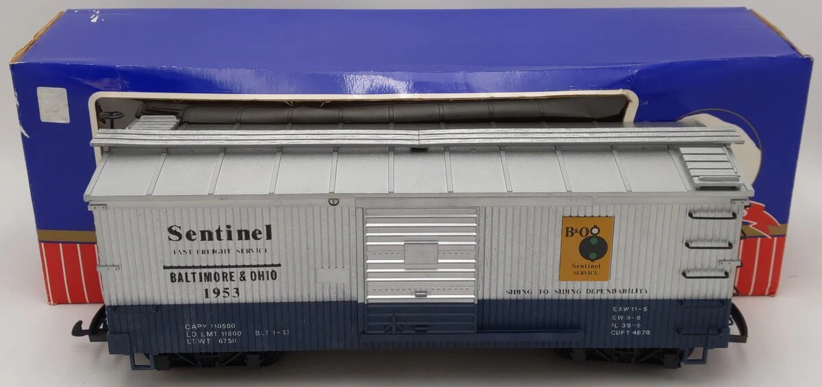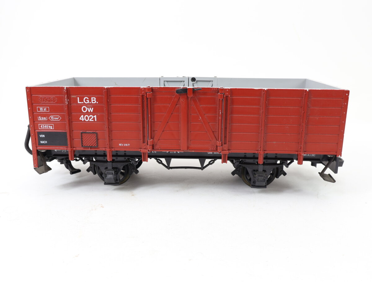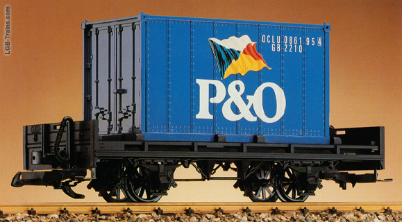 Das Modell mit der Artikelnummer 5057 ist ein robuster Niederbordwagen der Marke LGB, der mit einem abnehmbaren P&O-Container beladen ist. Dieser zweiachsige Güterwagen überzeugt durch seine wetterfeste Verarbeitung und authentische Beschriftung, was ihn zur idealen Ergänzung für Güterzüge macht.