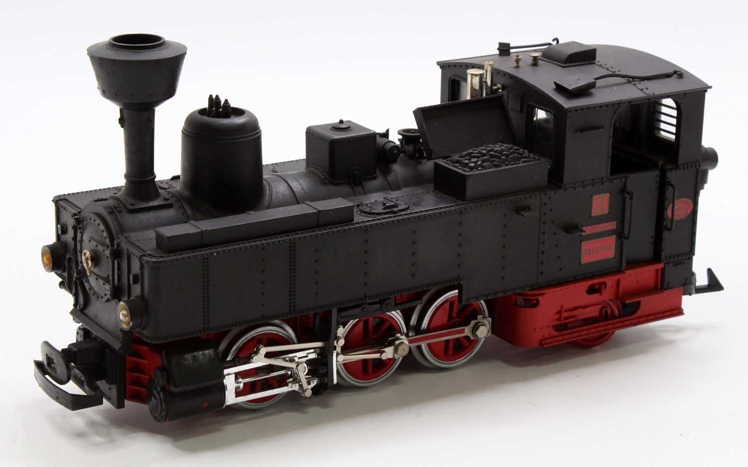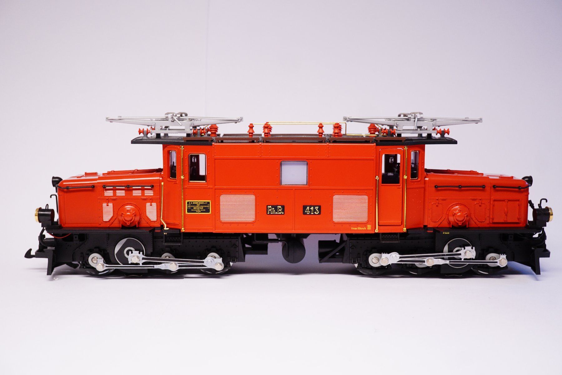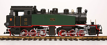 Das LGB Modell ist eine exakte Nachbildung dieser formschönen Lok: Antrieb auf allen sechs Treibrädern. 2 zusätzliche Schieneschleifer.Ein elektronisches 5-Volt-Begrenzungssystem sorgt dafür, dass schon bei Langsamfahrten die Beleuchtung gleich bleibend hell leuchtet und der Rauchentwickler in Betrieb gesetzt wird. Über ein Dreiwegschiebeschalter lassen sich die verschiedenen Funktionen einstellen.